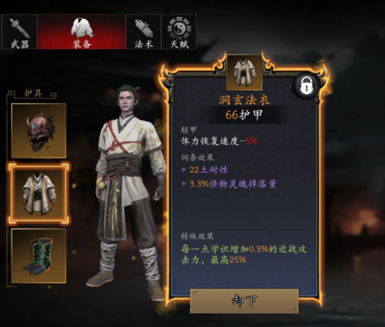 新装备洞玄法衣可以搞,84点学识可以吃满25%加成近战,这个加成的是武器攻击和力气修正之后的总近战攻击(5618×1.25=7022),面板总近战攻击加成,性价比极高值得刷,搭配重甲幽冥头和一个中甲鞋,还能触发新法器效果,喝酒解除异常状态。