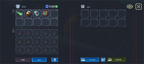 2、玩家可以点击背包按键整理当前拥有的物品,同时可以对装备进行选择;
