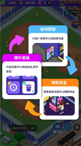 -经典模拟经营玩法设计,玩家需要合理运用手中资源对电玩城进行升级,以提高运营效果;