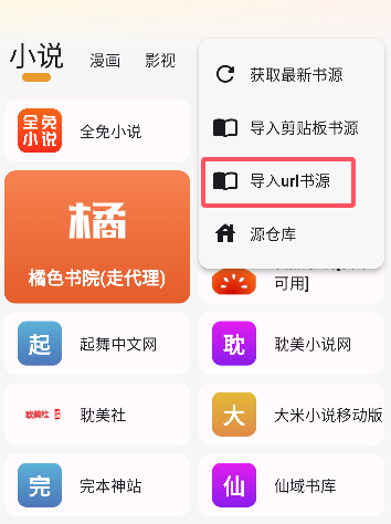 3、在下拉弹窗中找到【导入URL书源】,点击以后会出现弹窗。