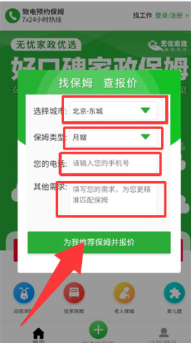 5、输入你的地址和相关信息,填写需要什么样的保姆,然后就会为你推荐符合要求人选。