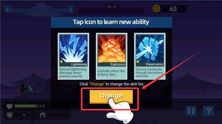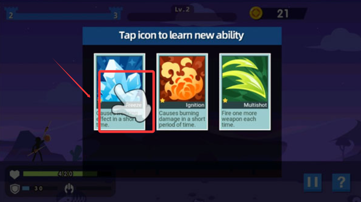 3、丰富技能系统:解锁冰冻、分裂等特效箭矢,增强战斗策略。