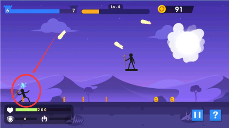 7、如图这种手持法杖的火柴人发射的是火球,火球落到身上会让你的生命力下降,你手中的武器也可以打破火球。