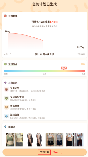 3、多维度数据监测,记录体重、体脂等关键指标,可视化展示减重趋势变化。