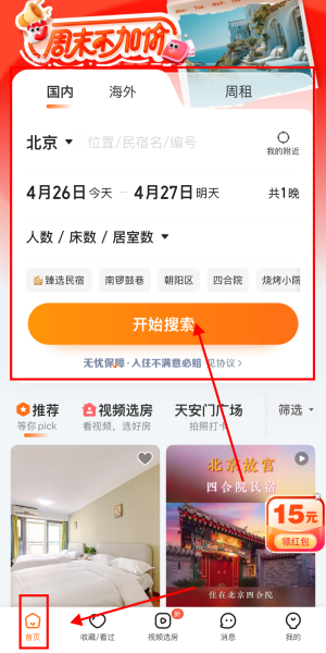 3、在首页中就可以输入城市、位置、日期等信息,点击“开始搜索”就可以办理住宿了。