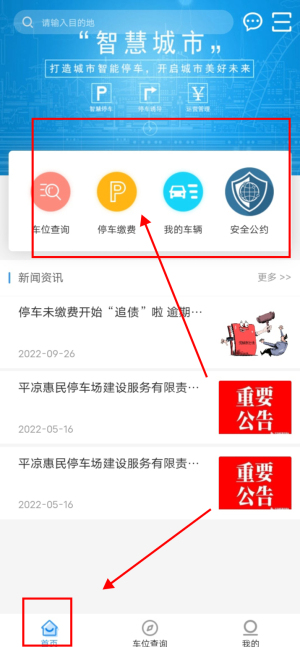 3、在首页中可以查看到车位查询、停车缴费等服务。