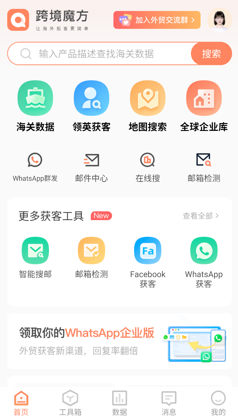 跨境魔方是外贸行业数据获客的得力助手,打造一站式跨境电商获客管理系统,助力业务增长。 它支持PC网页端与APP移动端双端操作,数据同步便捷。拥有超7亿全球海关数据,覆盖70多个国家地区,借助Google地图精准搜索全球商家信息。 营销工具多样,EDM邮件营销可实时跟踪,短信营销多国覆盖,还能系统管理邮件、短信模板。客户中心能一键存档客户信息与沟通记录,防止客户流失,还可深度挖掘新老用户数据,输出市场策略。从获客到客户管理,跨境魔方为外贸业务提供可靠支持。