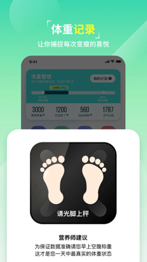 1、首次使用需完成身体评估测试,设置合理的阶段性减重目标。