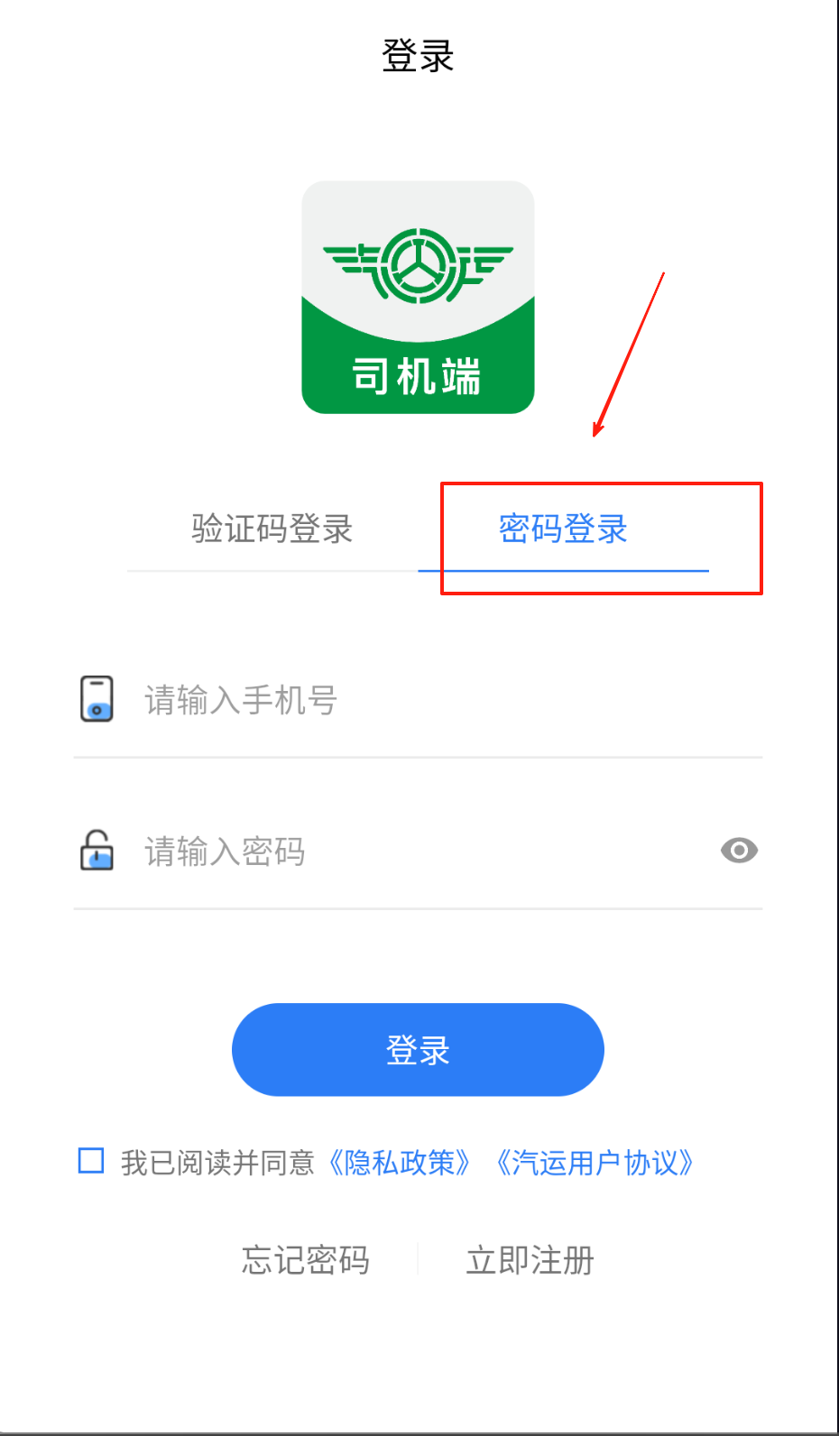 2、密码登录方式:进入登录界面选择密码登录,输入已注册的手机号与对应密码,注意勾选协议条款前的复选框。