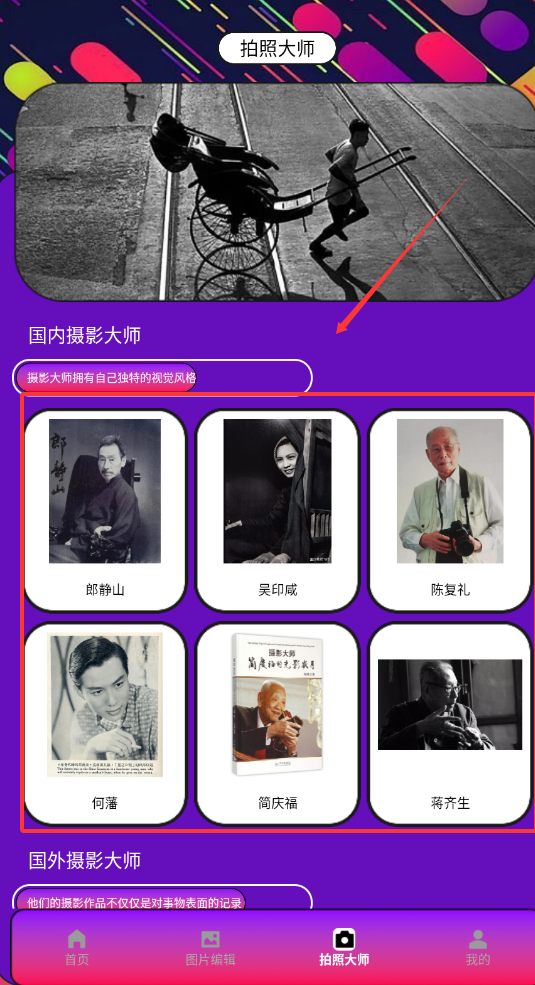 3、在拍照大师内,可以查看有名的摄影师简介。