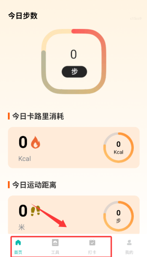 1、启动应用后,系统自动记录实时步数并在首页显示运动数据。