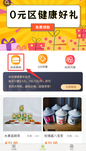 1、登录应用后,在首页导航栏选择"健康商城"功能进入购物专区。