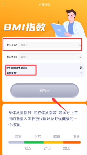 2、填写身高和体重数据,系统自动生成体质指数及健康建议。