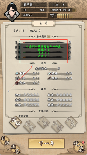 3、完成日常任务获取功法与资源,合理安排修炼计划,逐步提升各项属性与武学等级。