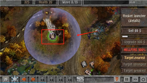 4、点击“Upgrade”按钮,花费金币对防御塔进行升级,以增强其攻击力和效果。