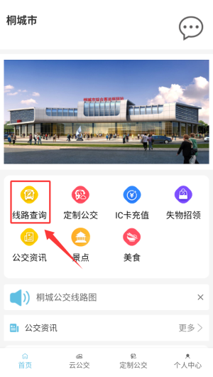 1、登录桐城掌上公交APP后,在首页功能栏选择"线路查询"选项,进入检索页面。