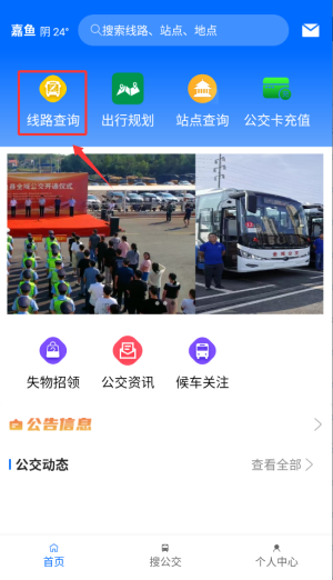 1、进入嘉鱼掌上公交APP后,在首页导航栏点击"线路查询"功能,进入搜索页面。