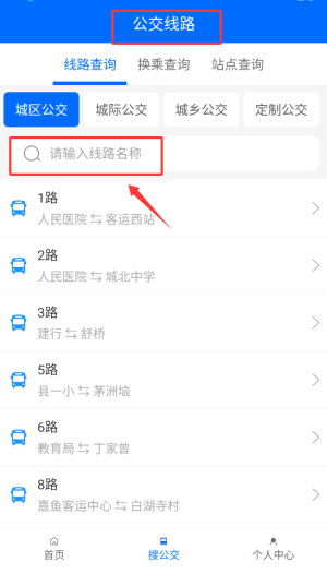 2、通过输入公交线路名称或编号进行检索,系统将自动匹配相关线路结果。