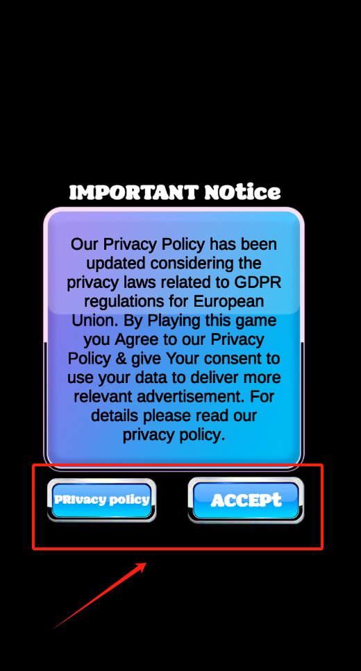 1、点击ACCEPT接受隐私政策才能玩游戏,或者点Privacy policy查看详情。
