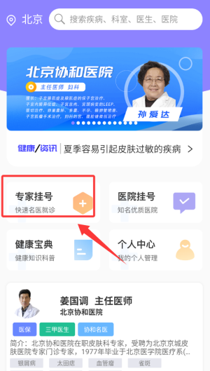 1、启动京医挂号APP后,在首页导航栏选择"专家预约"功能,进入医师排班查询界面。