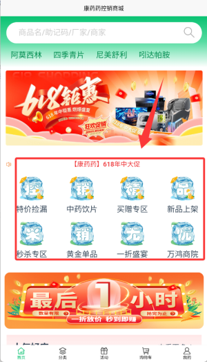 1、进入康药药APP后,在首页找到"药品商城"入口,选择活动专区查看优惠商品。