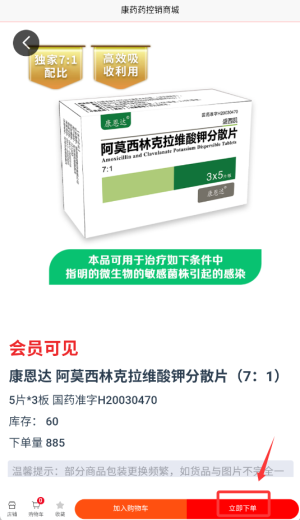 3、确认药品无误后,点击"立即下单"按钮,填写收货信息并完成支付即可等待配送。