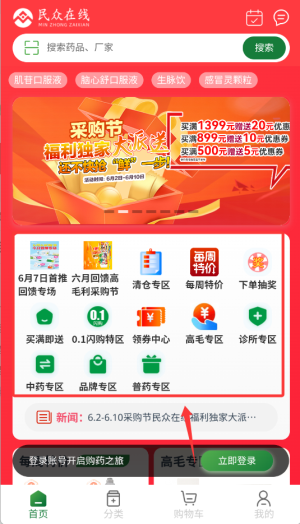 1、进入民众在线APP后,在首页栏直接点击"药品专区"按钮,跳转至药品选购页面。