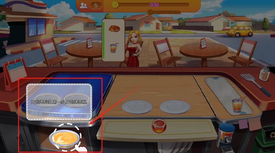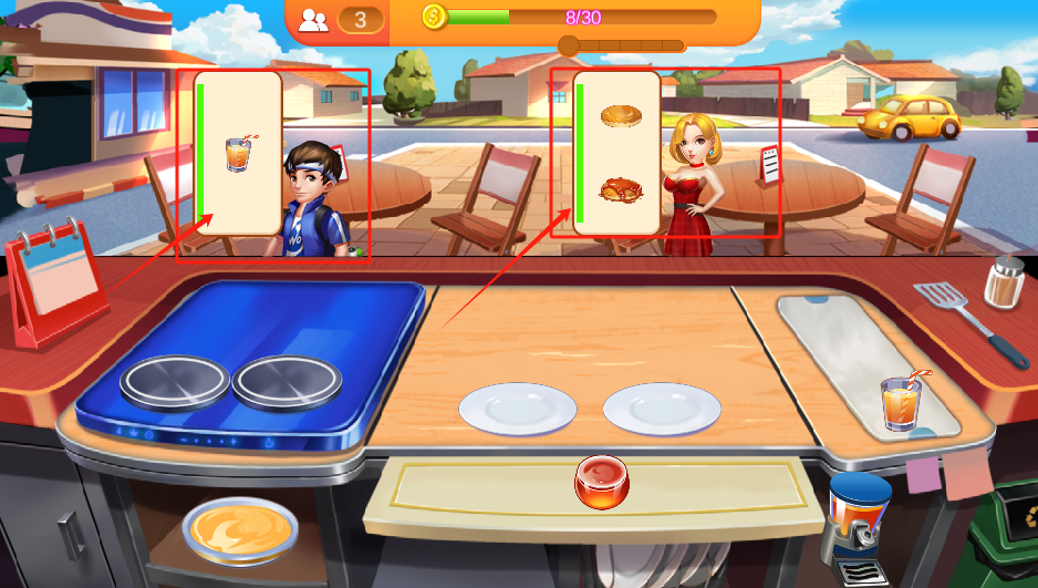 3、三个顾客等着点餐,快点做食物别让他们等急了。