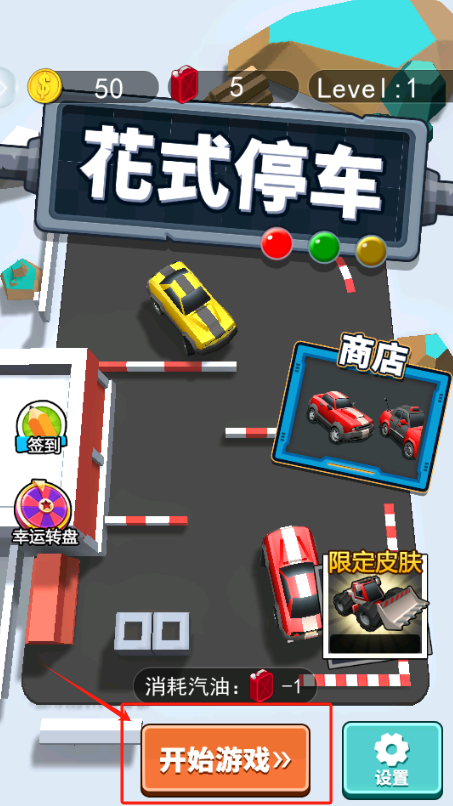 1、主界面点橙色开始游戏按钮消耗汽油,红框里的商店能买车。