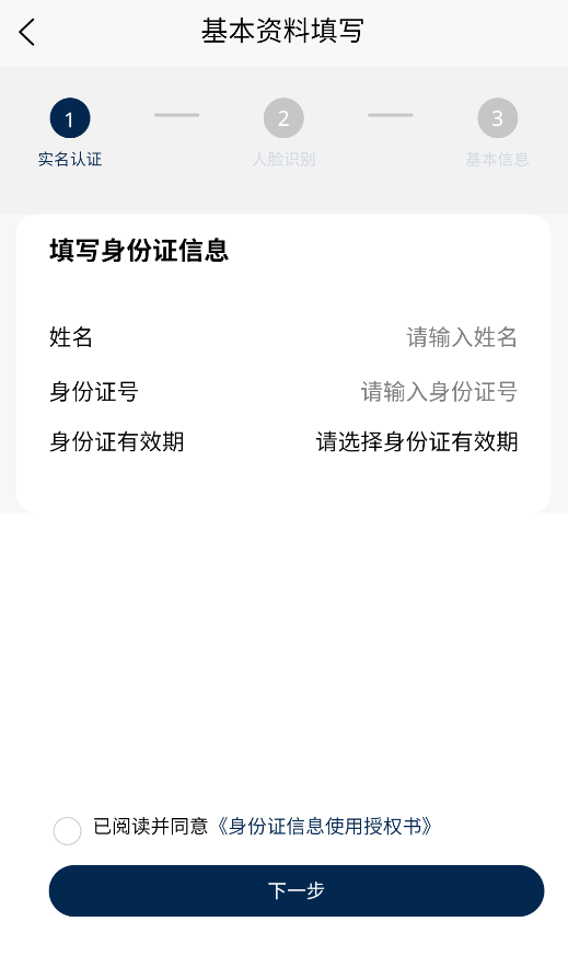 2、按照提示完善个人资料、完成人脸识别等身份验证步骤。