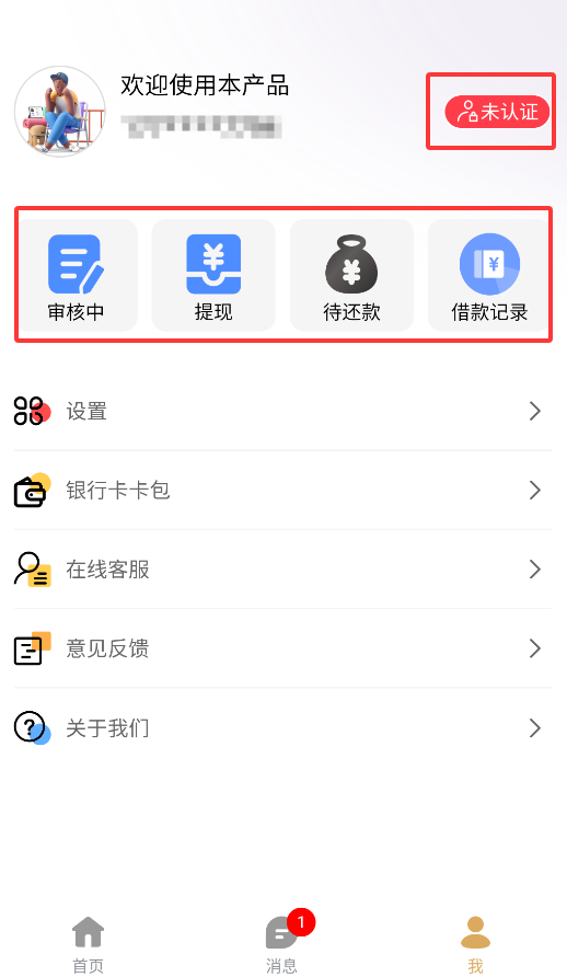 3、在"我的账户"页面,可以查看认证状态、审核进度、借款历史及提现记录等信息。