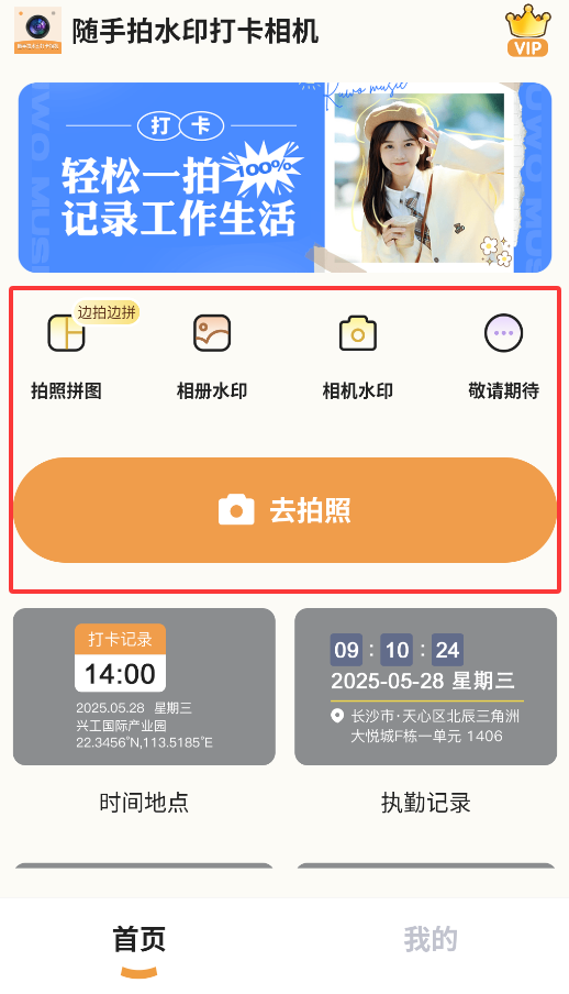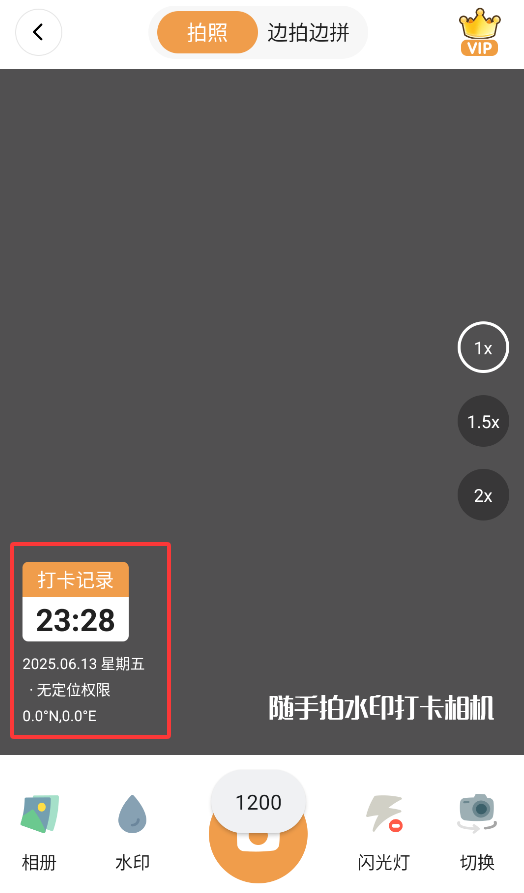 2、拍摄时系统自动添加包含时间、地点的打卡水印,显示在照片左下角位置。