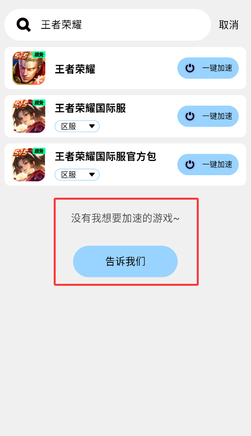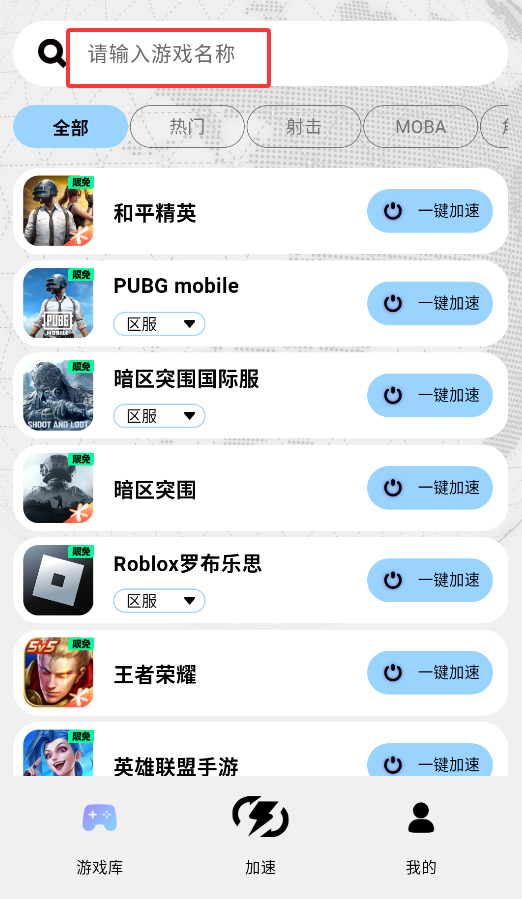 1、启动APP后,在首页搜索框输入游戏名称,系统会自动匹配相关加速节点。