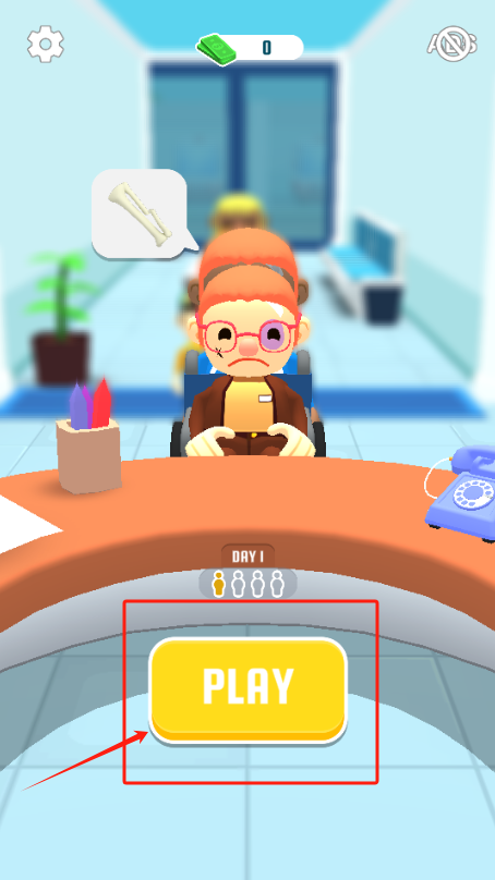1、点黄色PLAY按钮开始游戏,看前台戴眼镜的角色,物品栏显示0个绿色物品。
