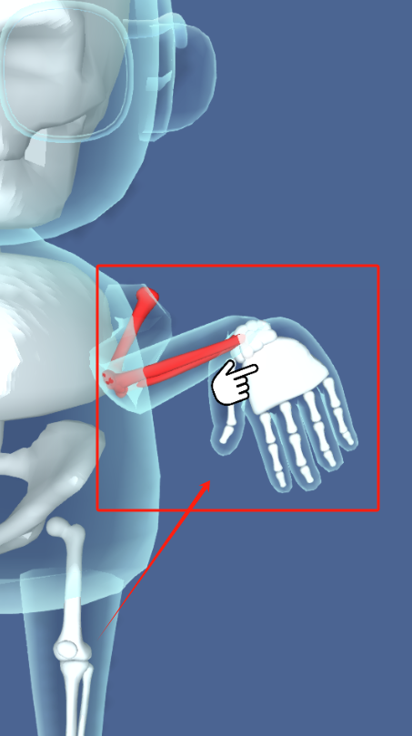 3、看红色框里的手部骨骼,小指骨上有手指图标,这是教学提示部分。