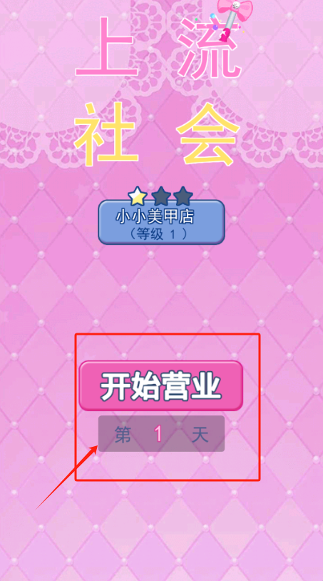 1、点粉色开始营业按钮开店,看左上角上流社会和小小美甲店等级1字样。