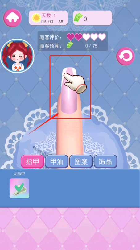 2、选指甲,甲油等选项做美甲,注意上方显示09:00和顾客预算0/75。