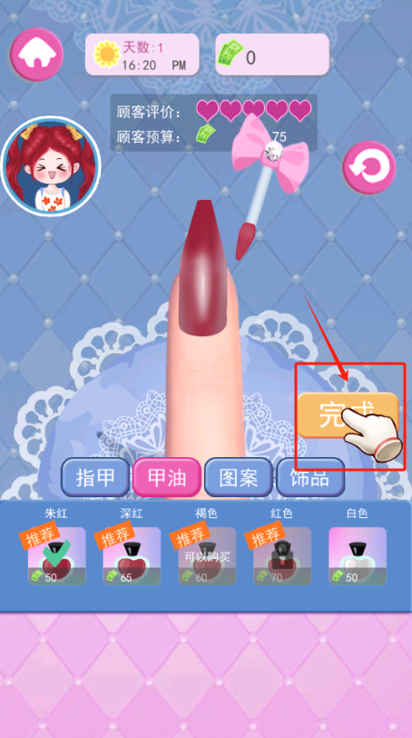 3、用甲油笔涂深红色指甲油,点橙色完成按钮交工,看顾客评价五颗星。