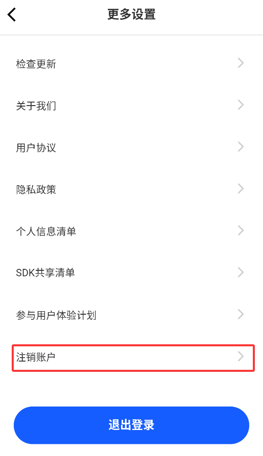 2、在设置菜单中找到"注销账户",点击"注销账户"功能按钮。