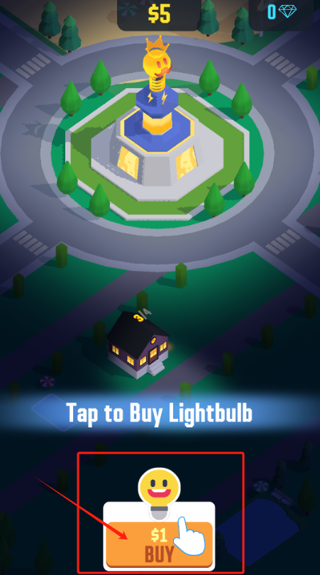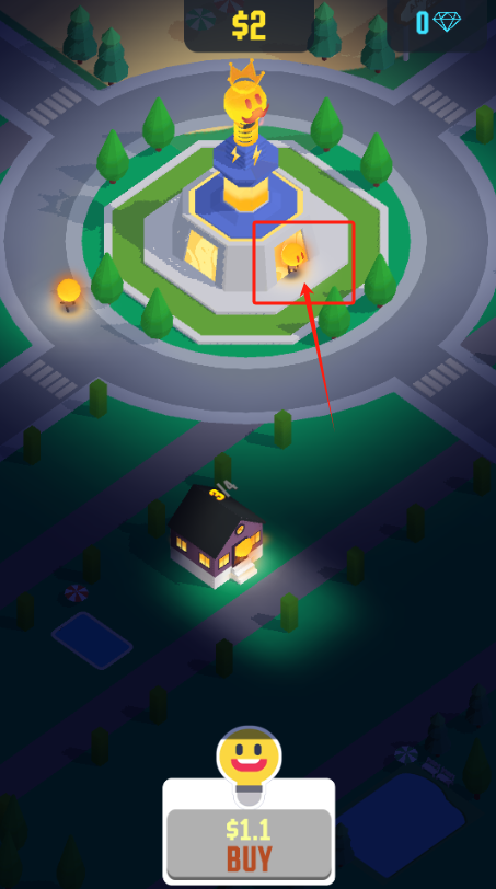 1、点红框里1美元的灯泡图标,花1块钱买灯泡,钱够就能点亮雕塑。