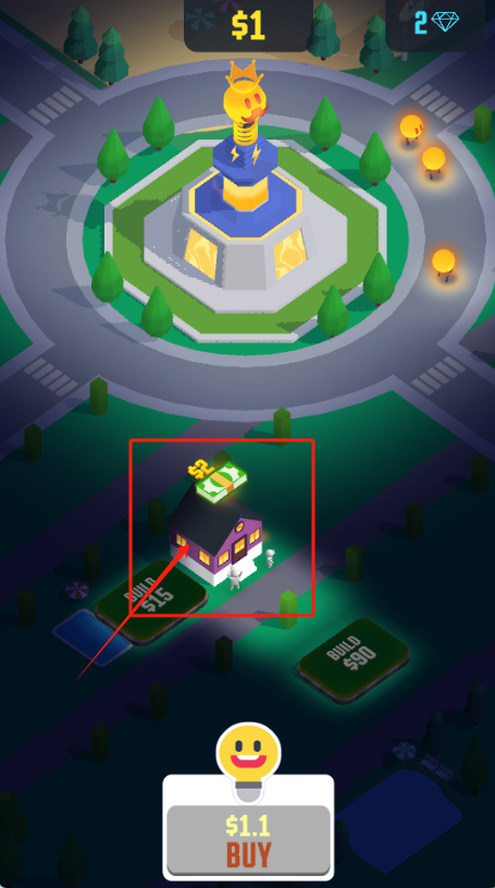 2、攒够1.1美元点红框里的BUY按钮,买新建筑升级城市。