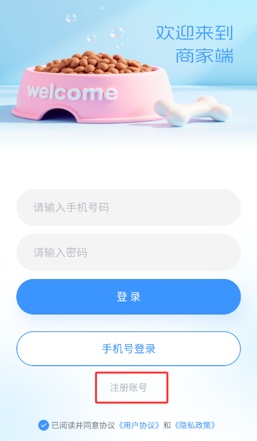 1、启动APP后,点击"商家注册"按钮,进入店铺账号创建页面。