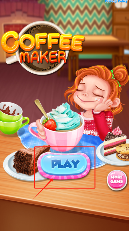 1、点红框里的PLAY开始游戏,小女孩面前有饮料甜点,下面还有其他选项。