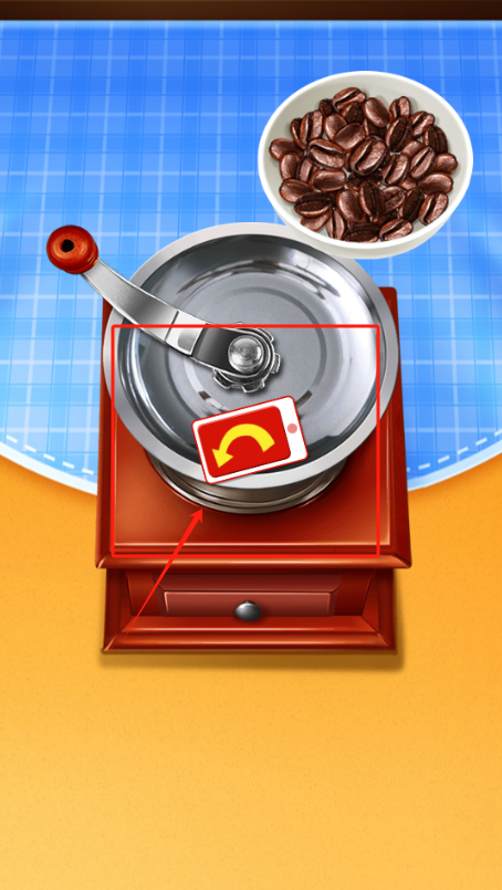 2、看绿色箭头提示,把台面上的咖啡豆倒进木质研磨机里,准备磨咖啡粉。