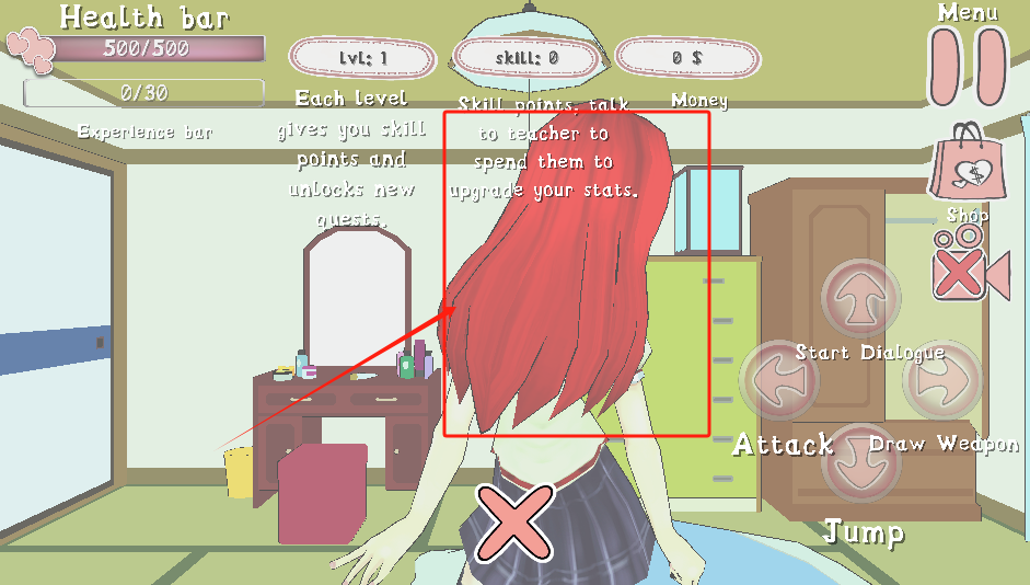 1、红发女孩刚睡醒,看生命值和等级信息,准备开始新的一天。