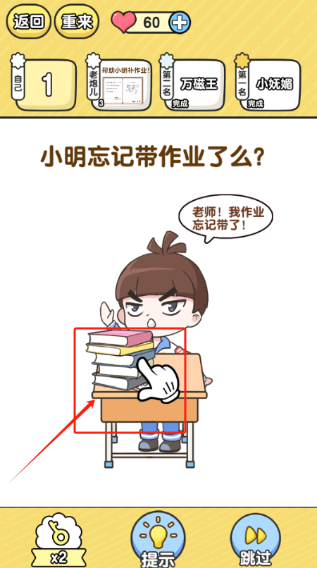 1、点提示按钮找线索,判断小明是不是真忘带作业,60颗爱心别用完。