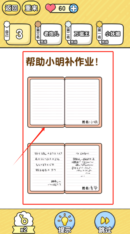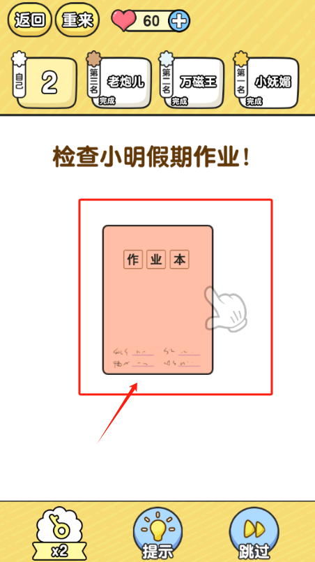 2、用红圈找出作业本里的问题,点x2能加分,错了就点重来。