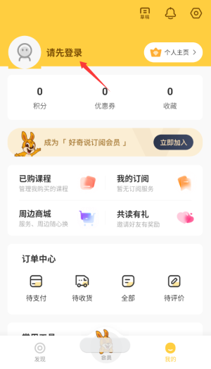 1、启动好奇说绘本APP后,点击底部导航栏"我的"图标,进入账户管理页面。