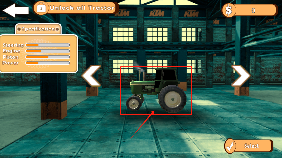 2、选红框里的绿拖拉机,看左边参数,钱够就点Select确认选择。