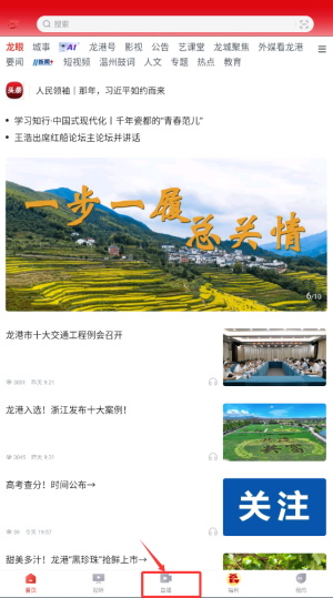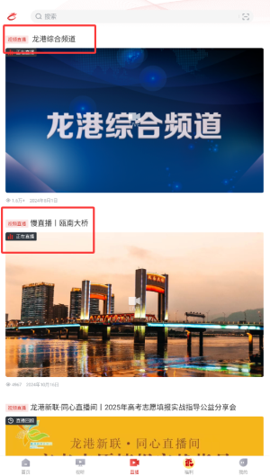 1、进入龙港在线APP后,在首页导航栏选择"直播"频道,这里展示各类本地实时直播内容。